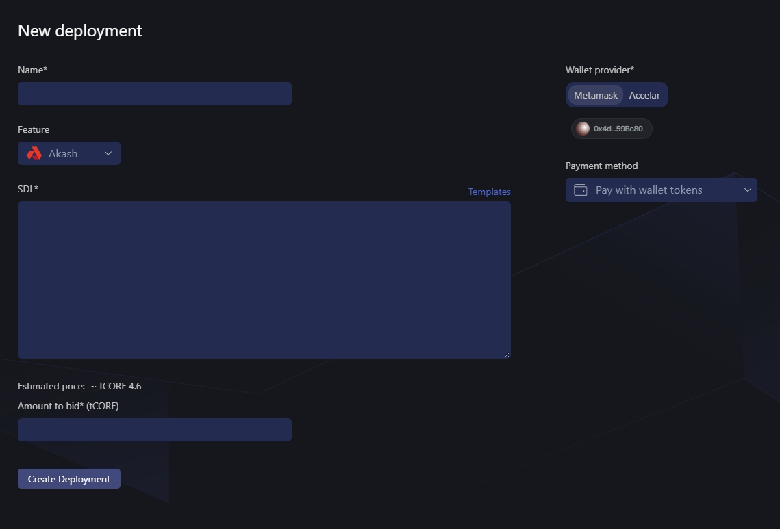 Here, you fill in the details of your deployment. The amount to bid corresponds to the number of Akash tokens that will be used for the deployment, with a minimum of 0.5 Akash tokens required.